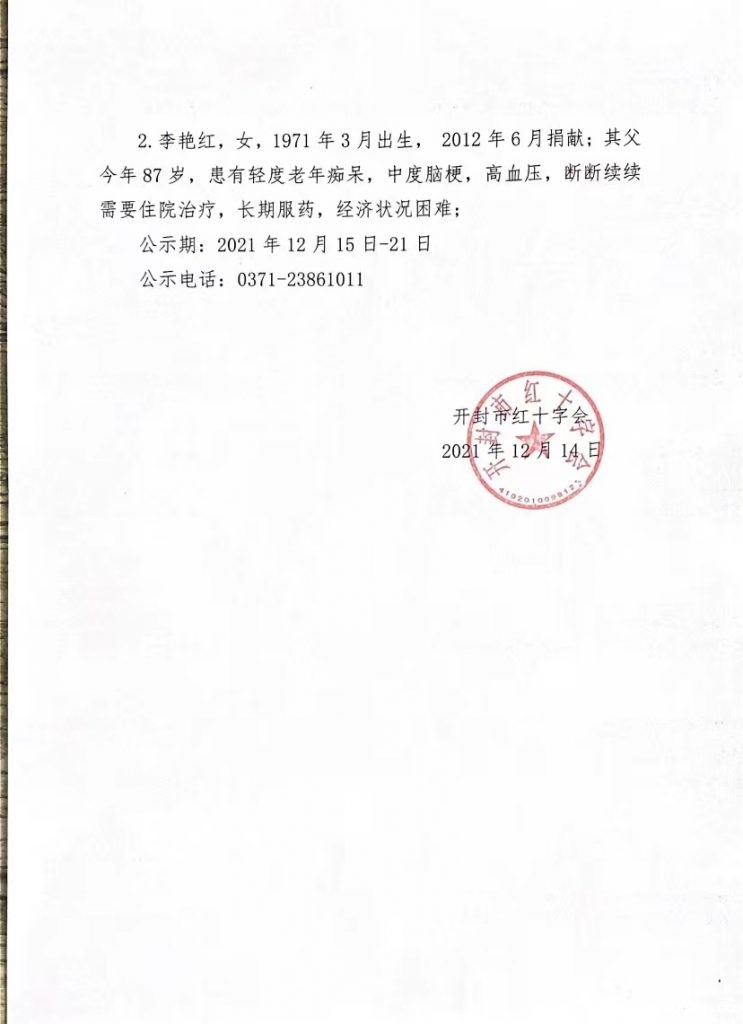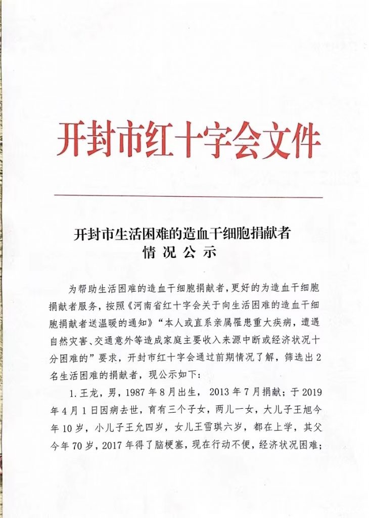 开封市生活困难的造血干细胞捐献者情况公示